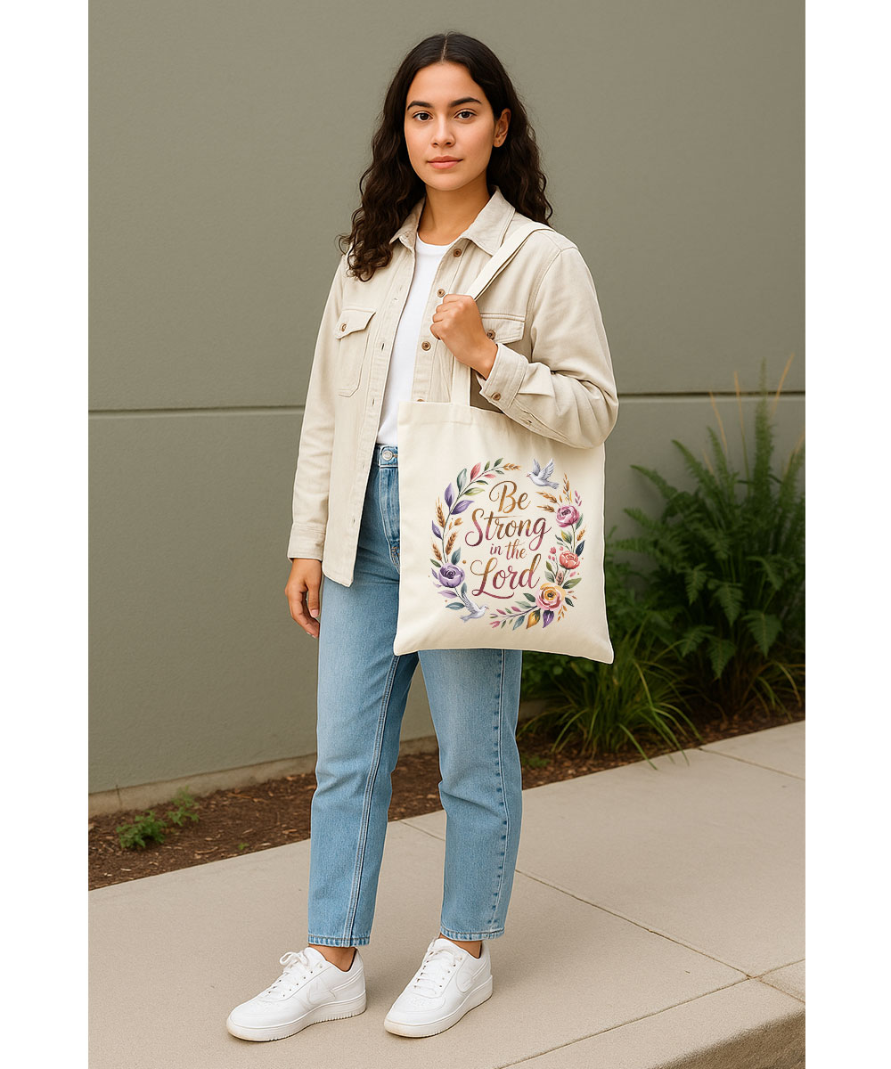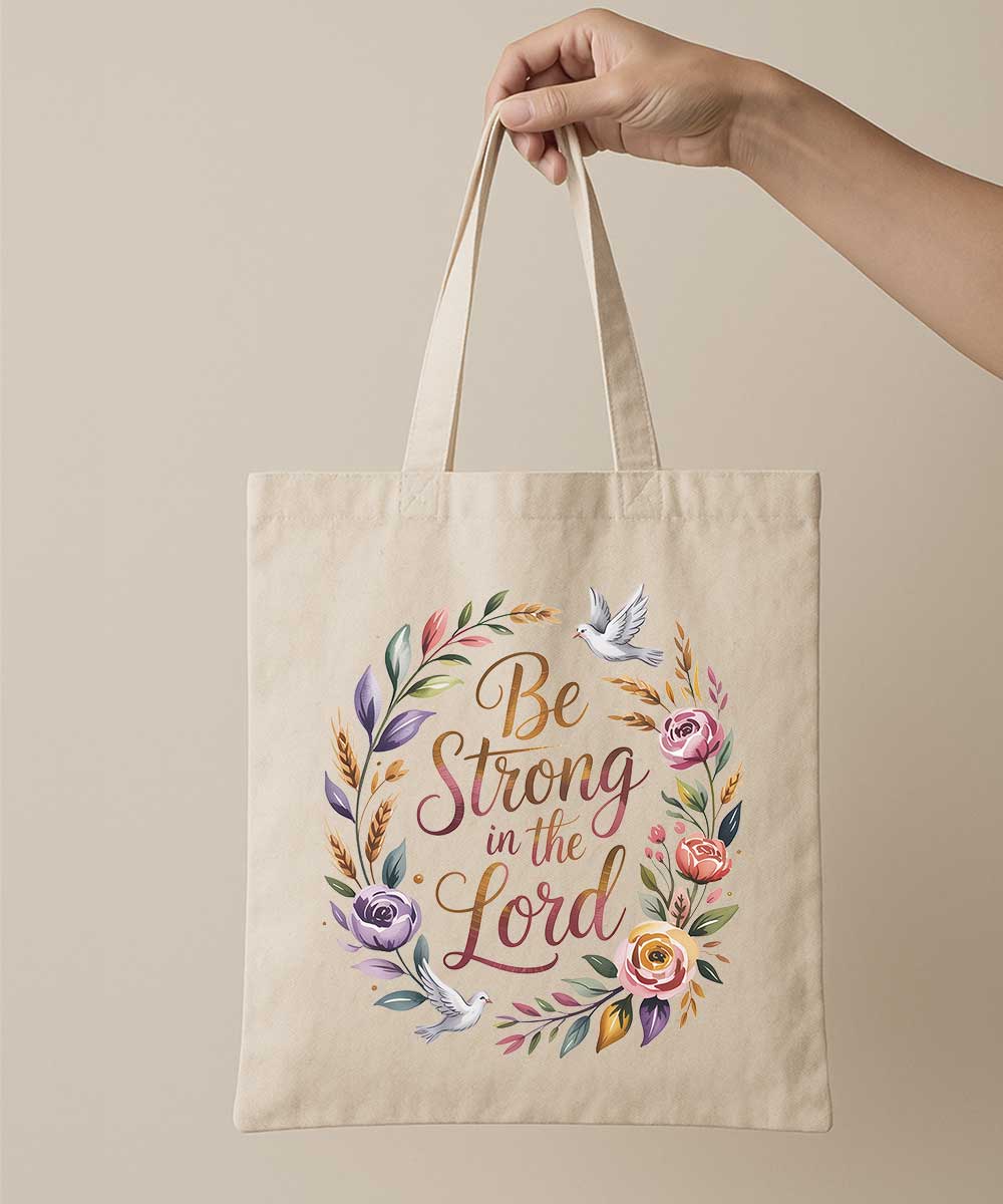 Find your courage and resilience in Him with our Be Strong in The Lord Christian Tote Bag. This beautifully designed tote serves as an empowering daily reminder to draw strength not from ourselves, but from His mighty and unfailing power, perfect for navigating life’s journey with faith.