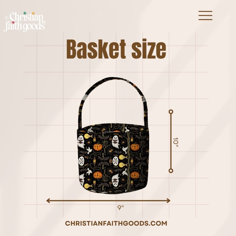 Make Halloween both fun and faith-inspired with our Scary Kids Christian Halloween Basket – Black Fabric Trick or Treat Bag with Spooky Design. This charming basket features playful yet spooky graphics of friendly ghosts, smiling pumpkins, crescent moons, and subtle Christian symbols like crosses, blending the joy of the season with a touch of faith.