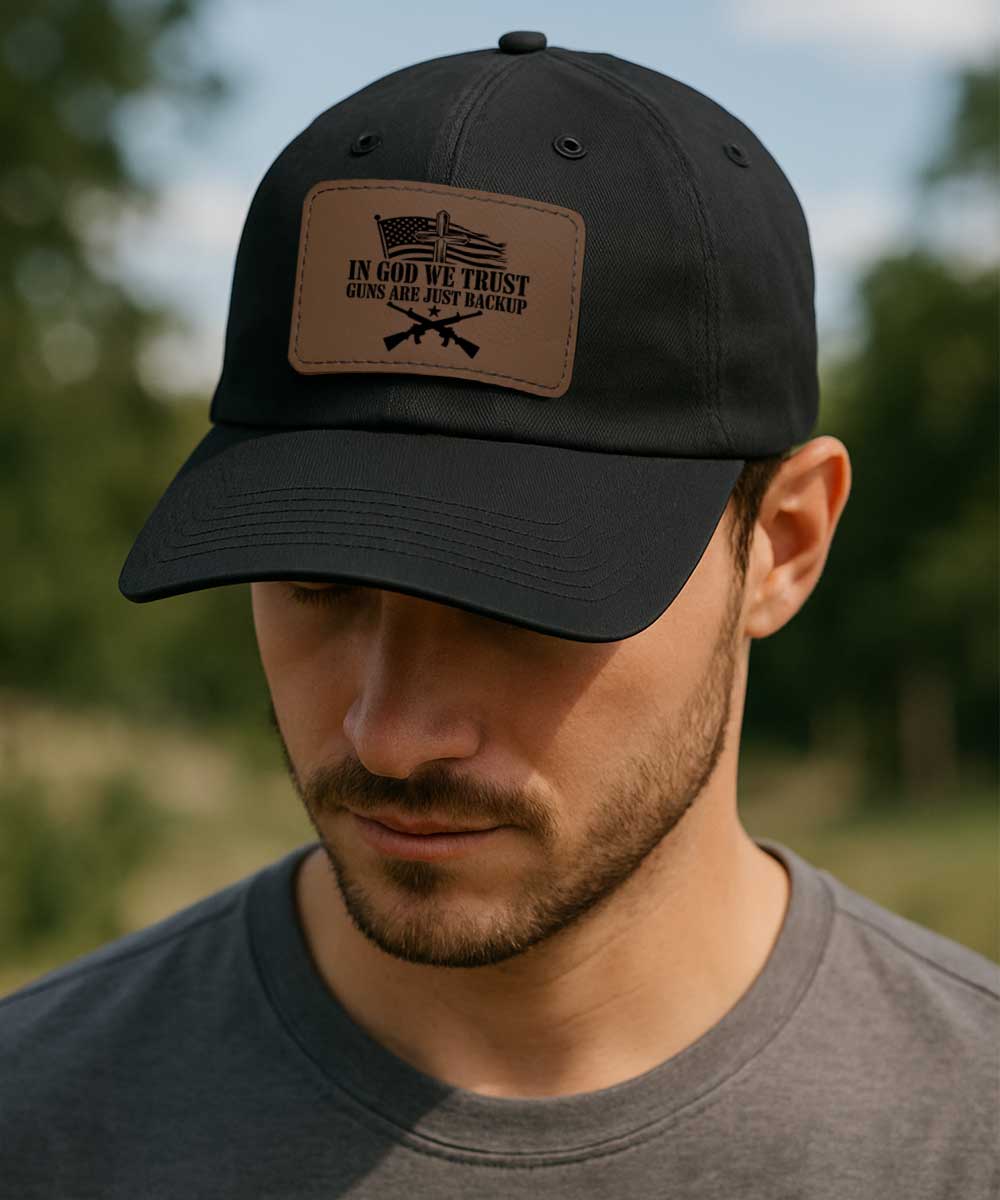- Faith-Forward Statement: The “In God We Trust Guns Are Just Backup” message on the faux leather patch clearly articulates a conviction, with an emphasis on placing ultimate trust in God.