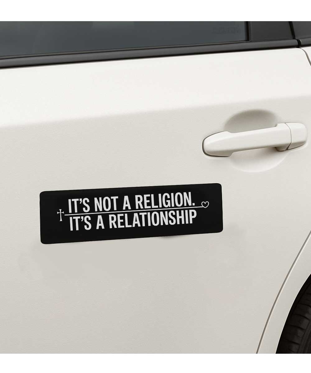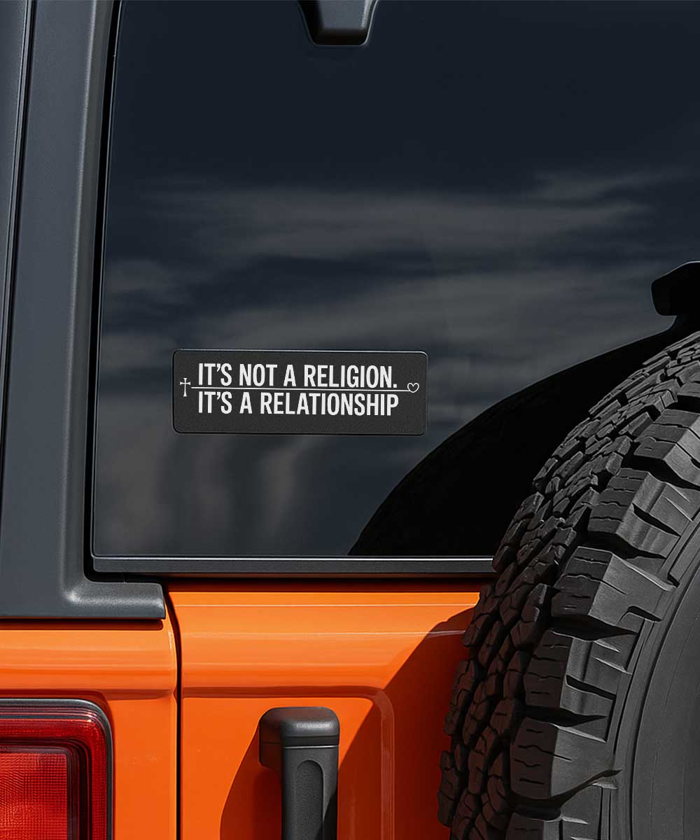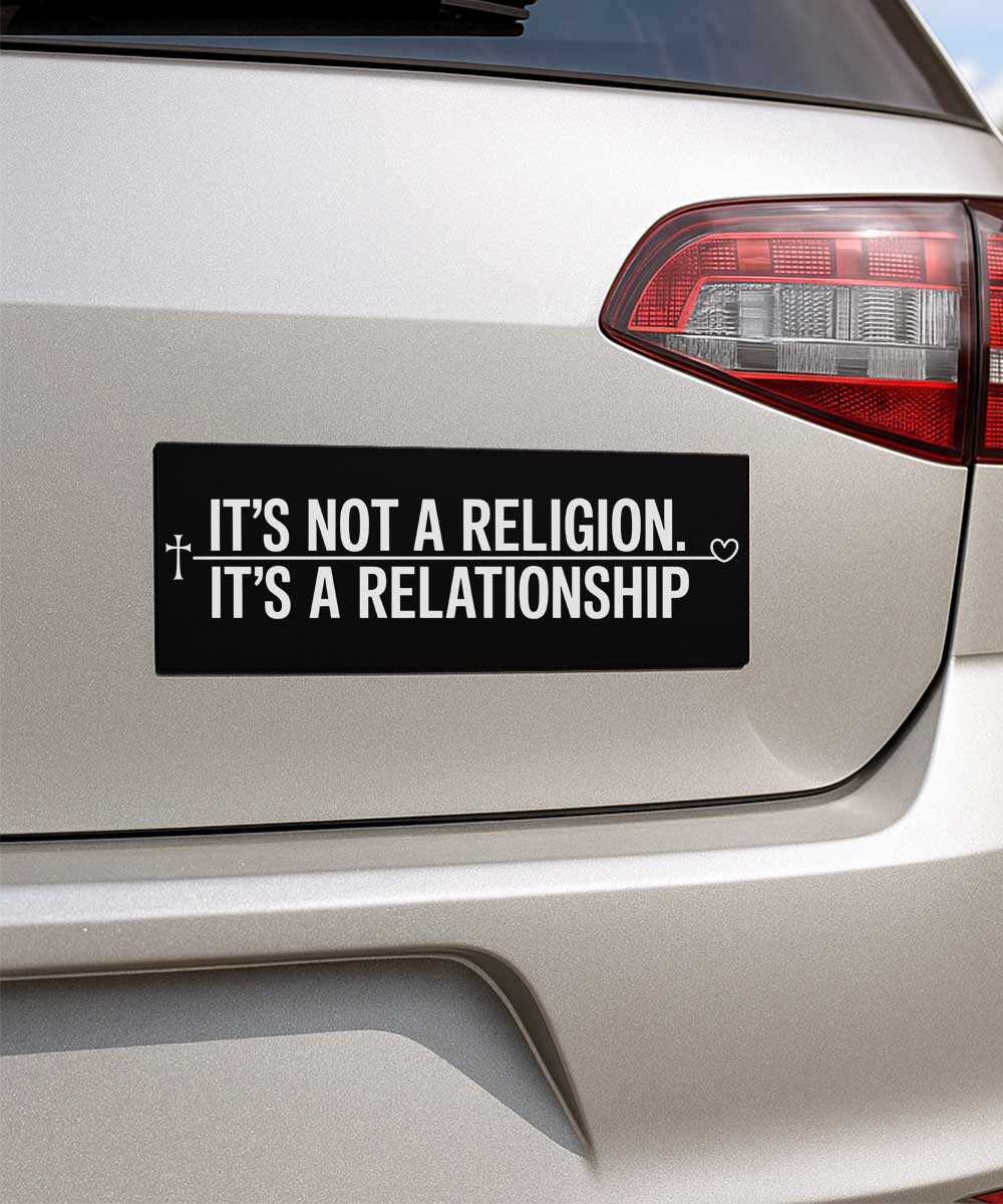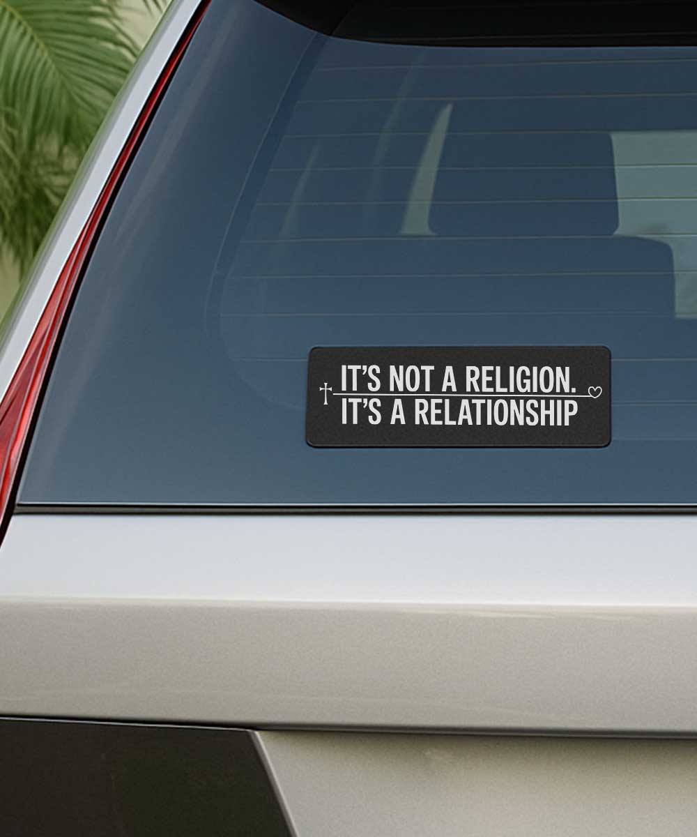 Our “It’s Not A Religion It’s A Relationship” Christian bumper sticker offers a simple yet profound way to express the personal nature of your belief. It’s more than just one of our Christian stickers; it’s a statement about the loving, ongoing connection that defines your walk with Jesus.