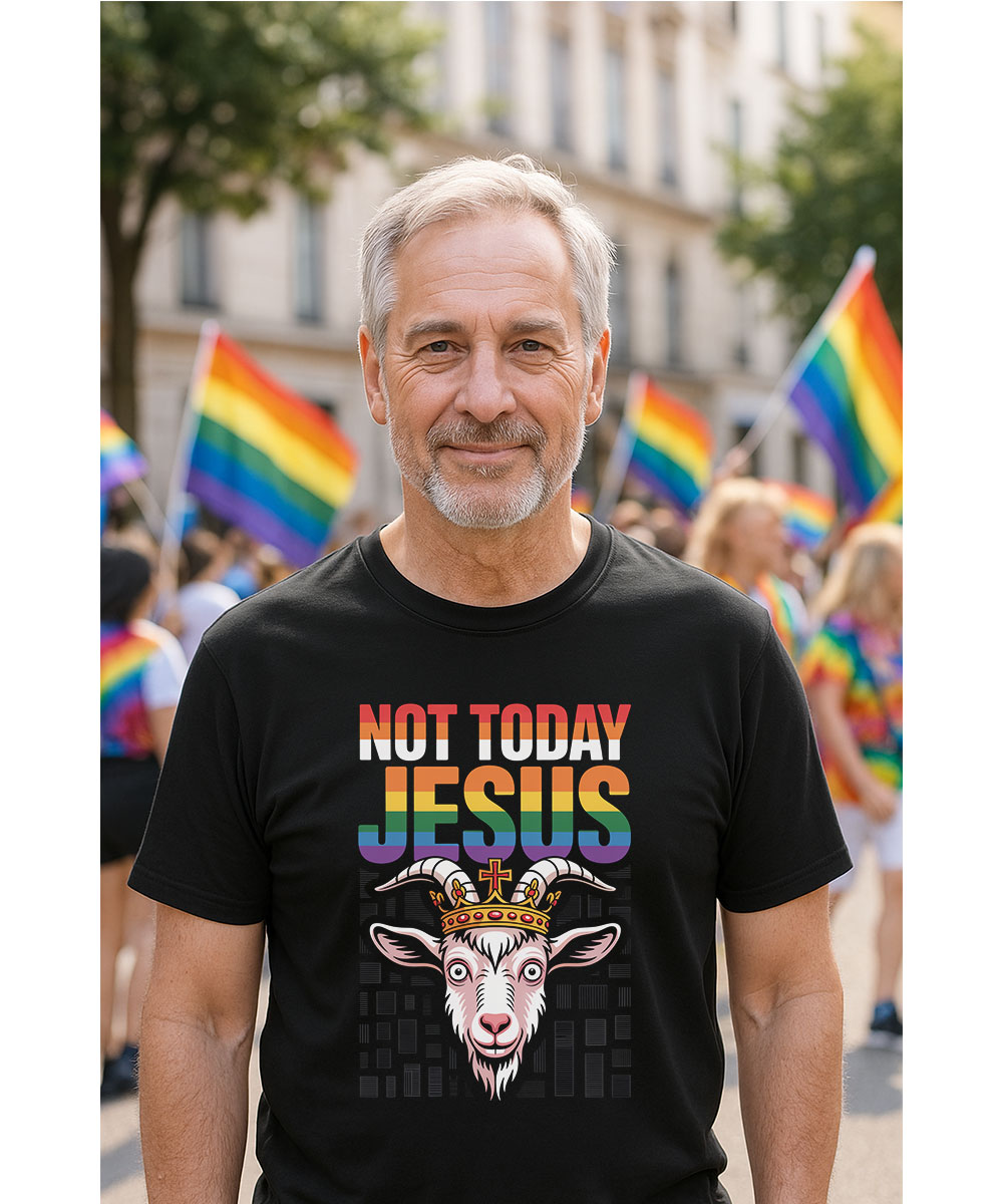 Wear your faith with a bold statement and a touch of humor with this Funny Not Today Jesus LGBT Pride Month Christian T-Shirt from Christian Faith Goods. Designed with a vibrant rainbow twist and a crowned goat graphic, this tee celebrates both your Christian beliefs and pride, making it a perfect conversation starter during Pride Month or any time you want to share hope and joy.