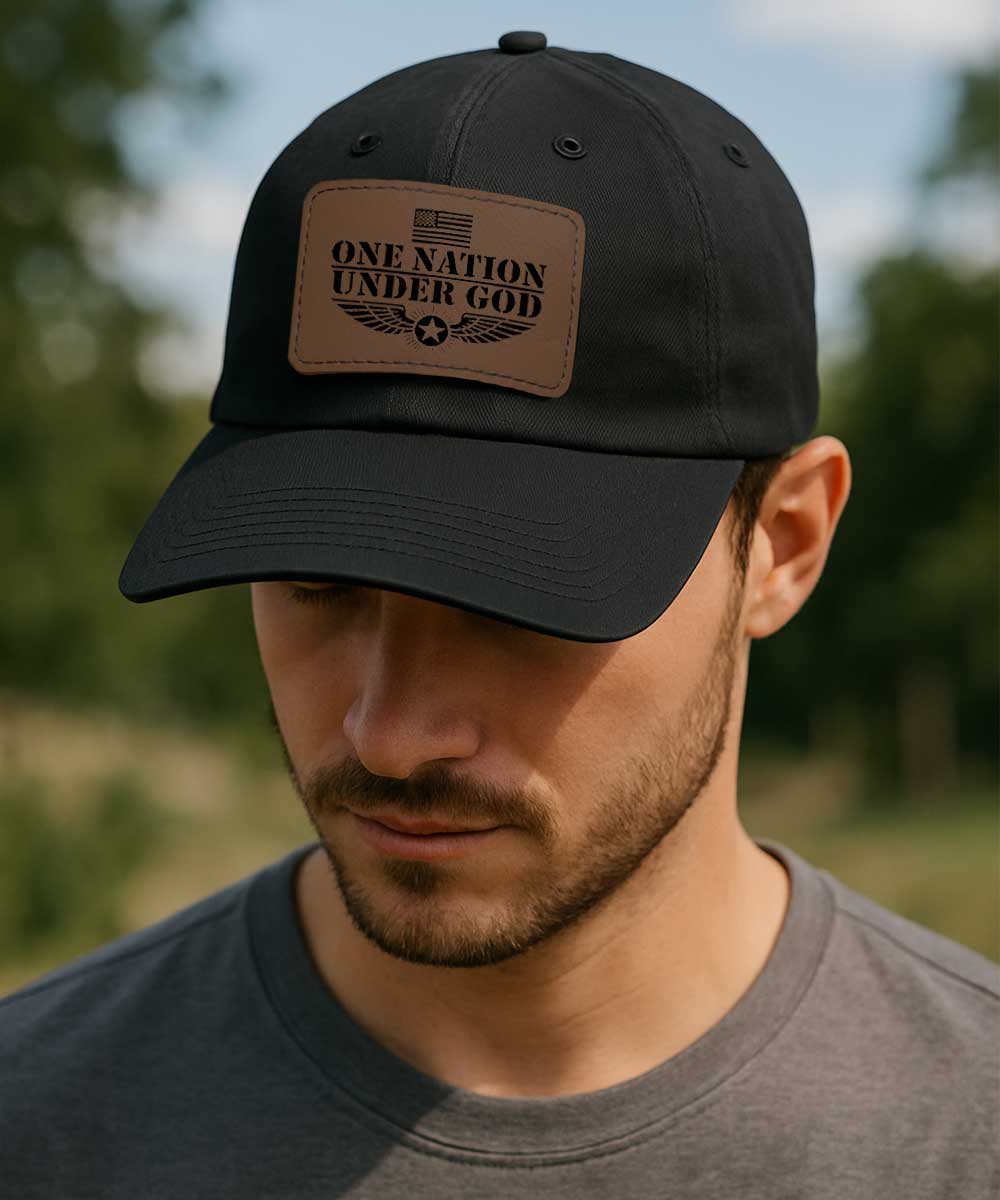 Wear a meaningful reminder of our nation’s pledge with this One Nation Under God christian hat. Featuring the significant phrase paired with flag, star, and wing elements on a quality faux leather patch, this classic dad hat is a comfortable way to express your faith and hope for unity under Him. It’s a thoughtful piece to help you Wear Your Faith. Share Your Hope.
