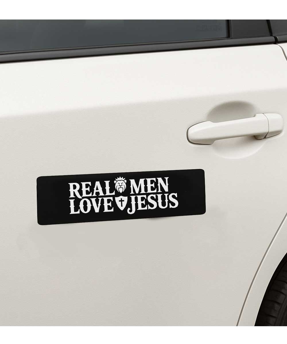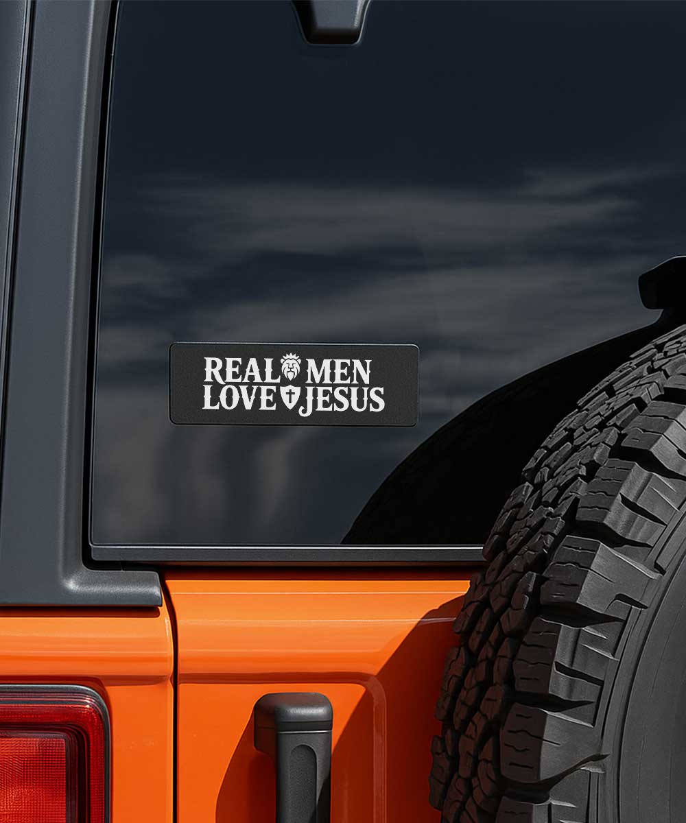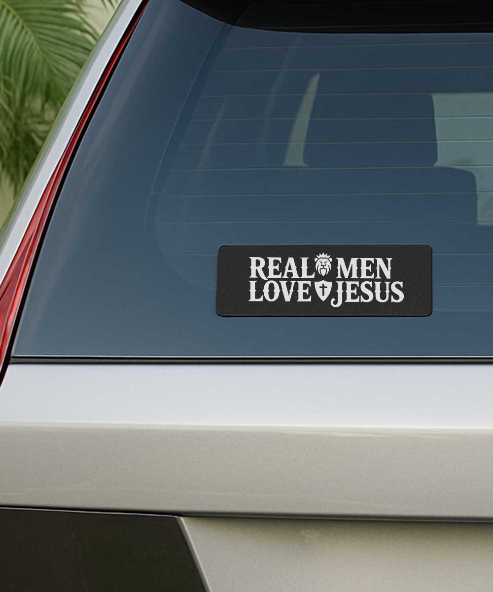 Our “Real Men Love Jesus” Christian bumper sticker is more than just an accessory; it’s a declaration. It’s one of the many Christian stickers we offer that allows you to make a clear and encouraging statement about what truly defines strength in your life.