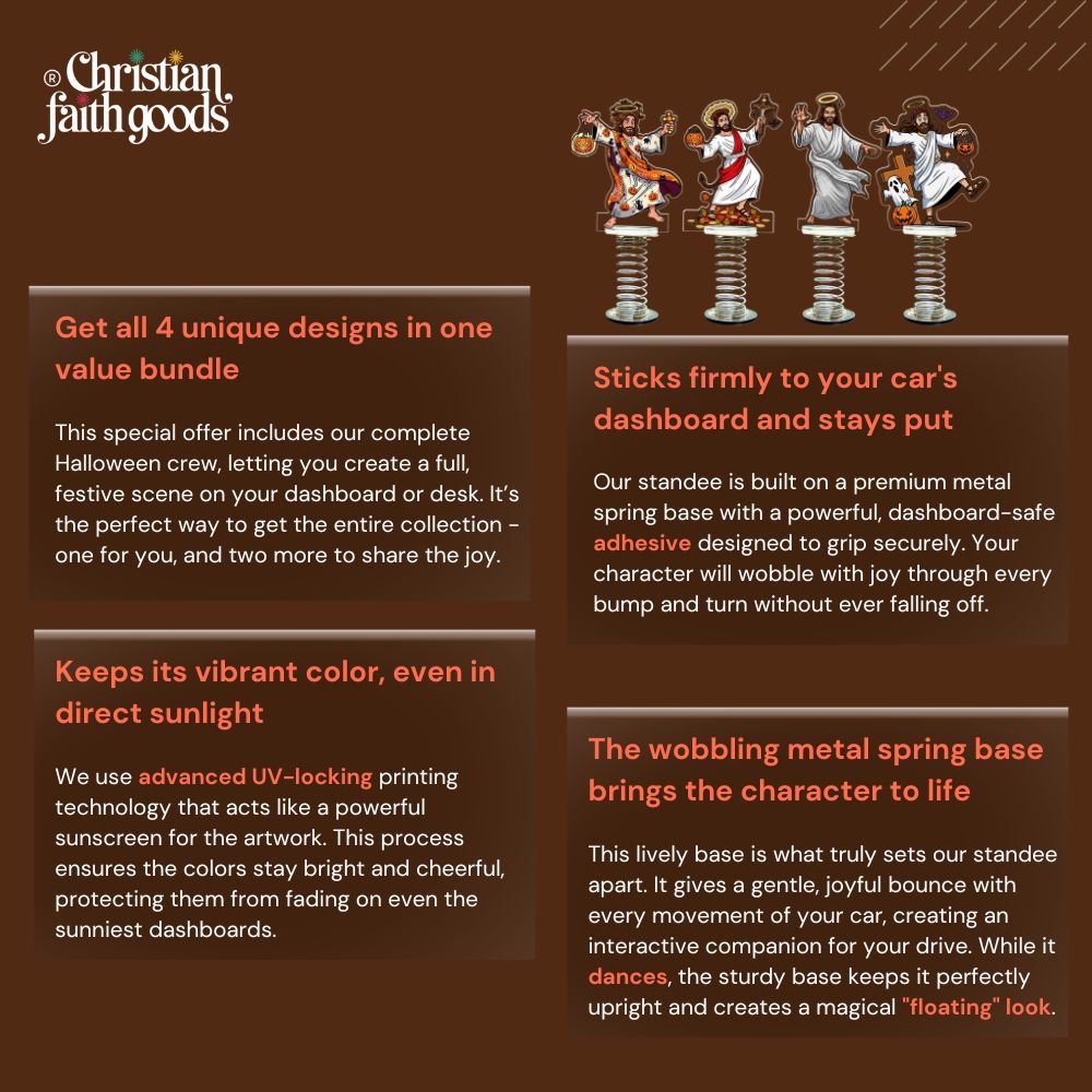 At Christian Faith Goods, we believe in sharing faith with both reverence and joy. These standees are more than just decor – theyโre conversation starters, laughter-lifters, and gentle reminders of the hope we have in Jesus (even when surrounded by jack-oโ-lanterns and candy corn).