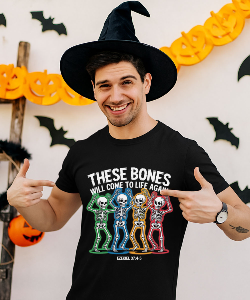Share the life-giving message of Ezekiel 37 with the THESE BONES WILL COME TO LIFE AGAIN Ezekiel 37:4-5 – Christian Halloween T-Shirt. Featuring colorful skeleton graphics paired with the powerful words from Scripture, this faith-filled shirt turns Halloween’s skeleton theme into a proclamation of God’s resurrection power.
